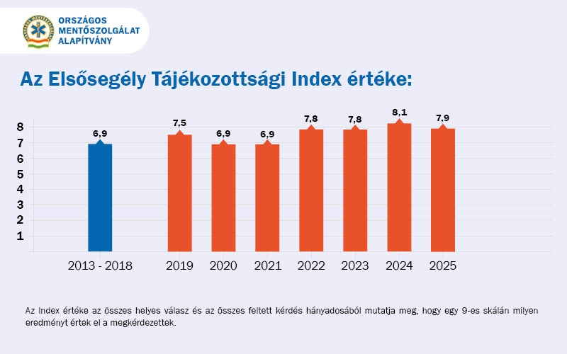 Kutatásunkat 2013 óta végezzük el a lakosság körében, és az eredmények szemléltetése és összehasonlíthatósága végett egy index-számmal összesítjük. Ez a szám, az Elsősegély Tájékozottsági Index (ETI) megmutatja, mennyi volt az összes helyes válasz és az összes feltett kérdés hányadosa: 2025-ben ez az érték 7,9 lett.