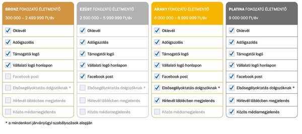 Bronz, Ezüst, Arany vagy Platina fokozatú támogatóként az Ön cége is hozzájárulhat céljaink, programjaink megvalósításához. Táblázatunkban részletesen tájékoztatjuk az egyes fokozatok jelentéséről. Bízunk abban, hogy vállalata támogatja életmentő munkánkat!